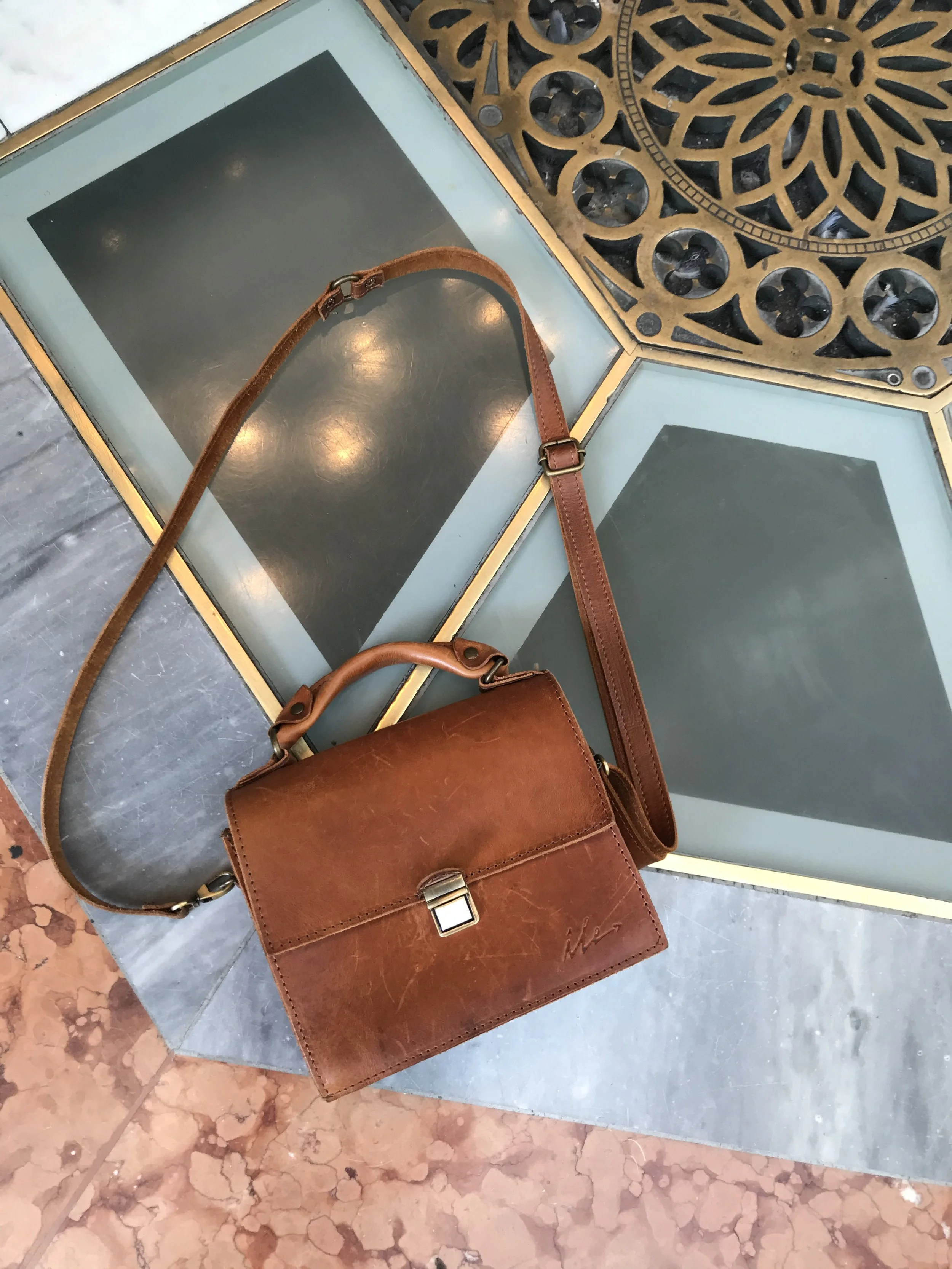Men tilbake til om dette virkelig var dett. Og veska av gardinen. Jeg tenkte med meg selv at den ville være flott i skinn. Jeg skisset den ned, sendte ned til Georgia, og fikk en helt nydelig veske i retur. Akkurat slik jeg hadde sett for meg, om mulig enda finere. Med en egen lomme til vannflaske, og med nøkkelstroppen og mobillomma som jeg hadde i gardinveska.
