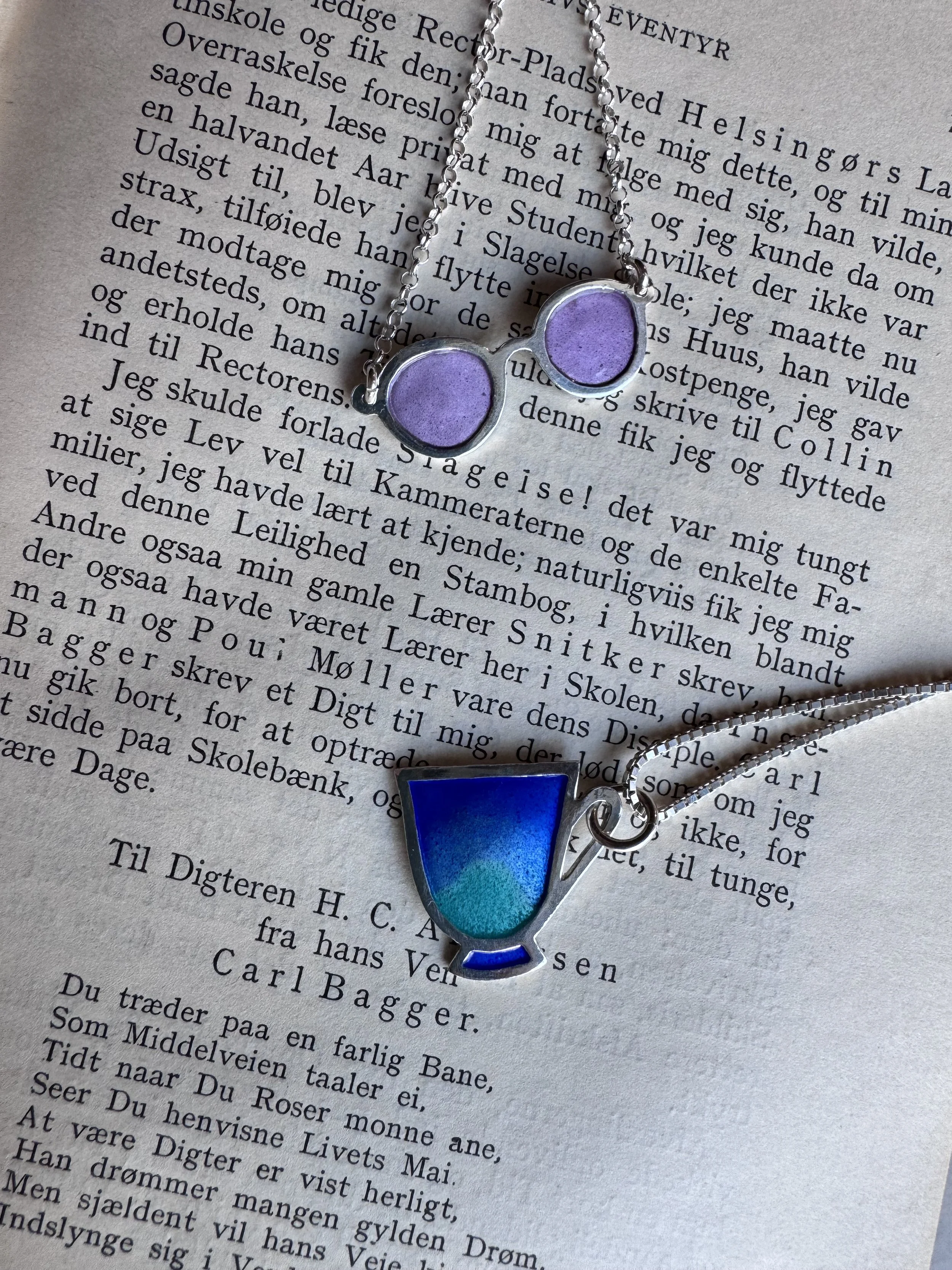 Anhenget kommer komplett med sølvkjede. Det er håndlaget på Risør, av Embla Design, og kommer i tre ulike emalje-farger.