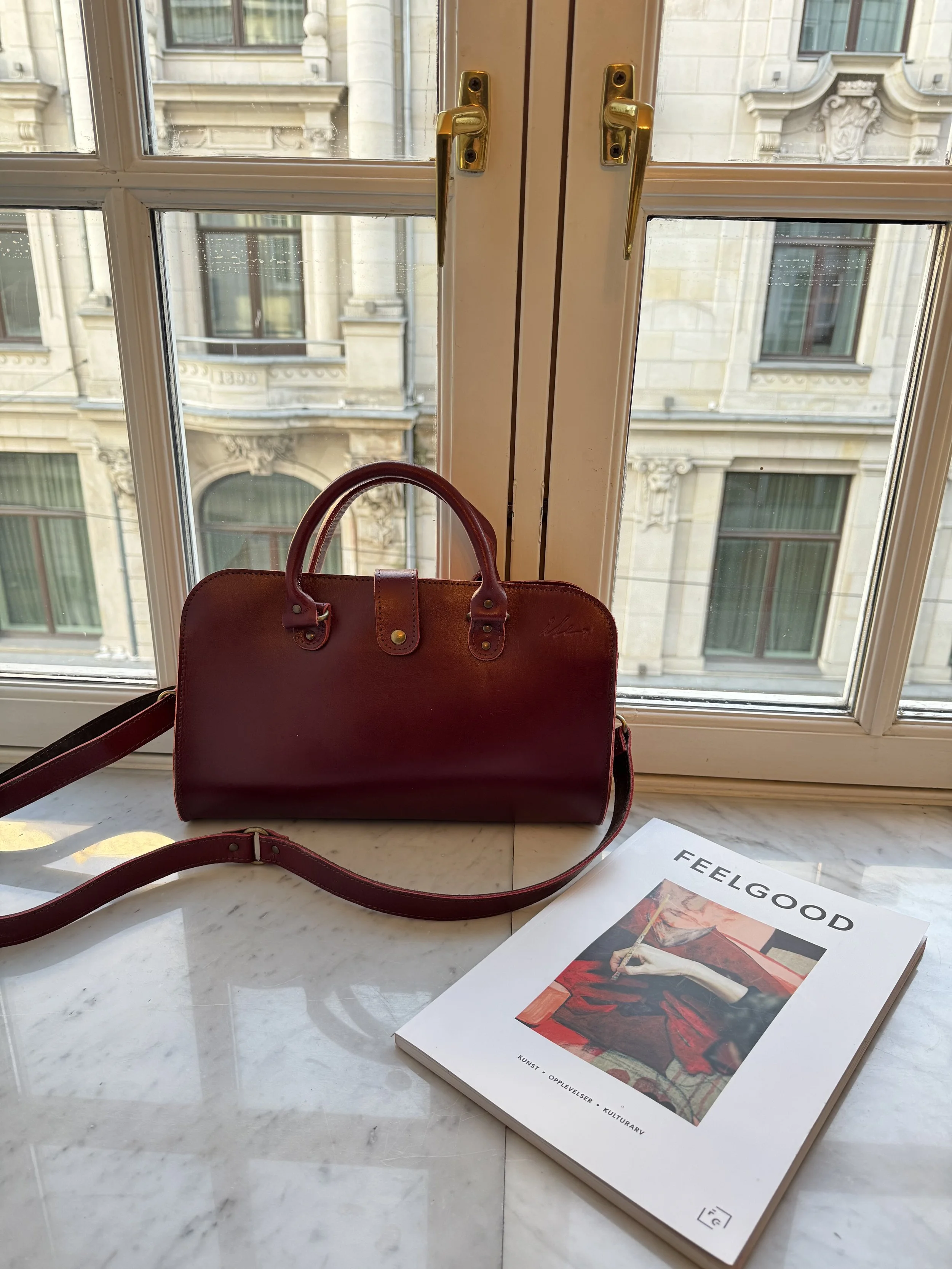 En liten veske dekortert med en dobbel blomst. Blomsten har jeg tegnet, den er trykket opp i to størrelser og utgjør en vakker dekor (for meg som elsker blomster) - og det en god måte å bruke resteskinn på. Blomsten er festet på magnetlukkingen til veska og gir veska en litt pyntet og feminin detalj som seiler opp på tronen som den søteste veska vi har laget.
