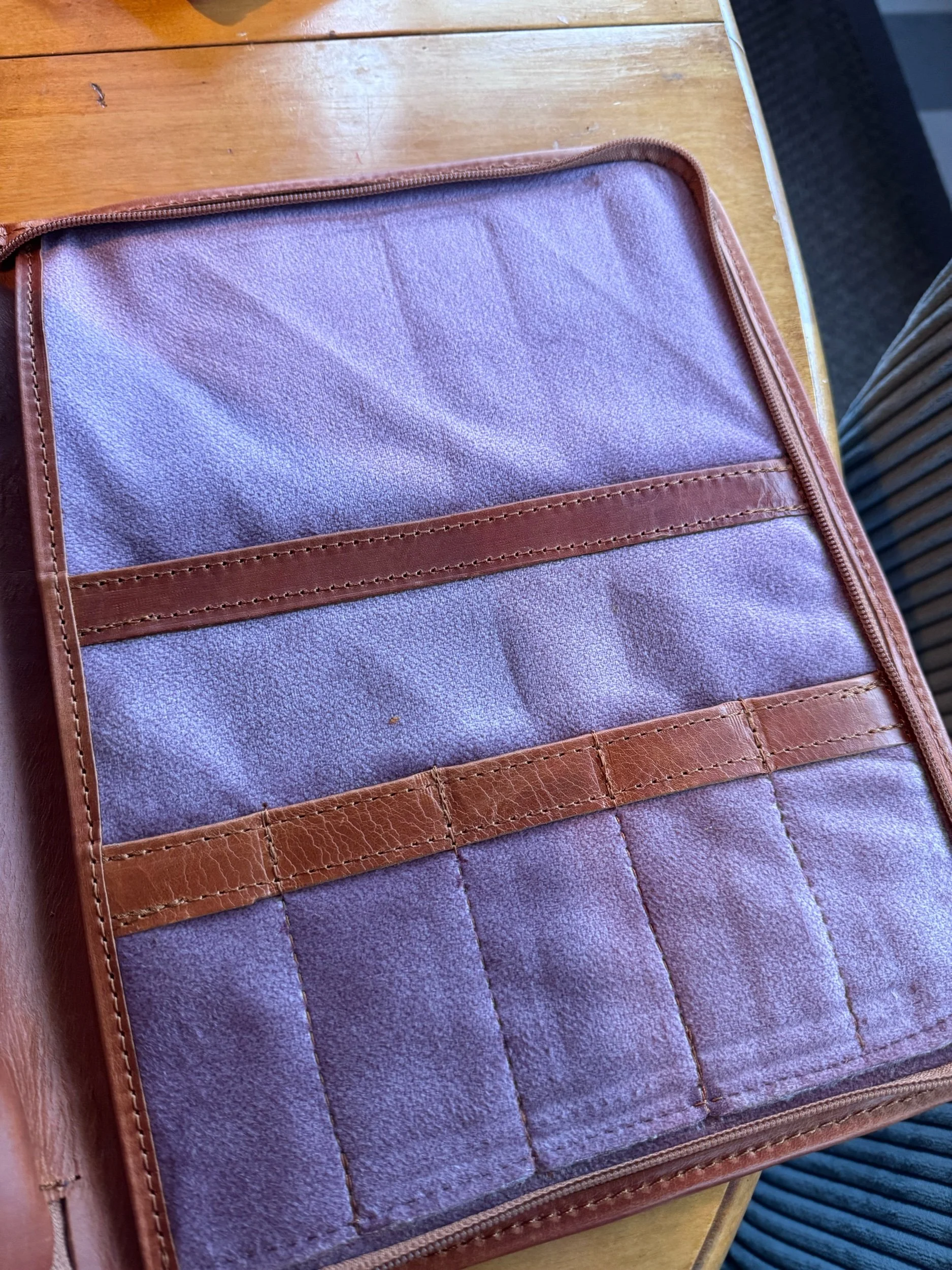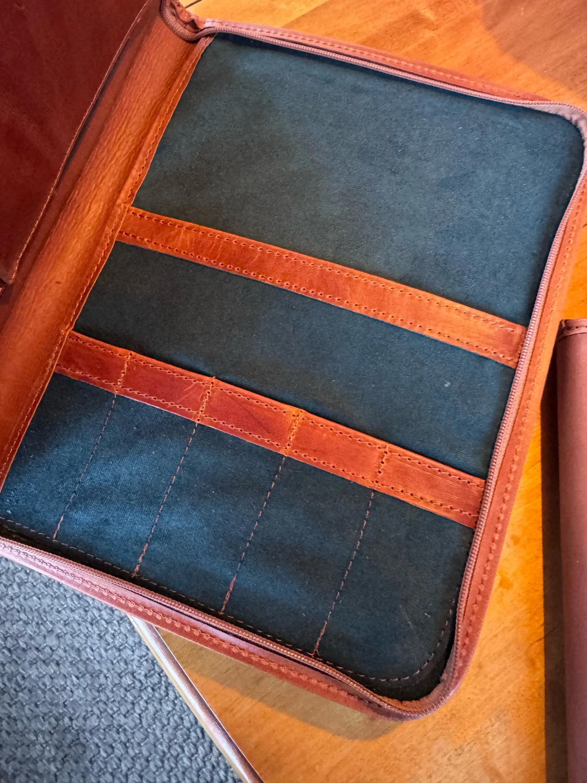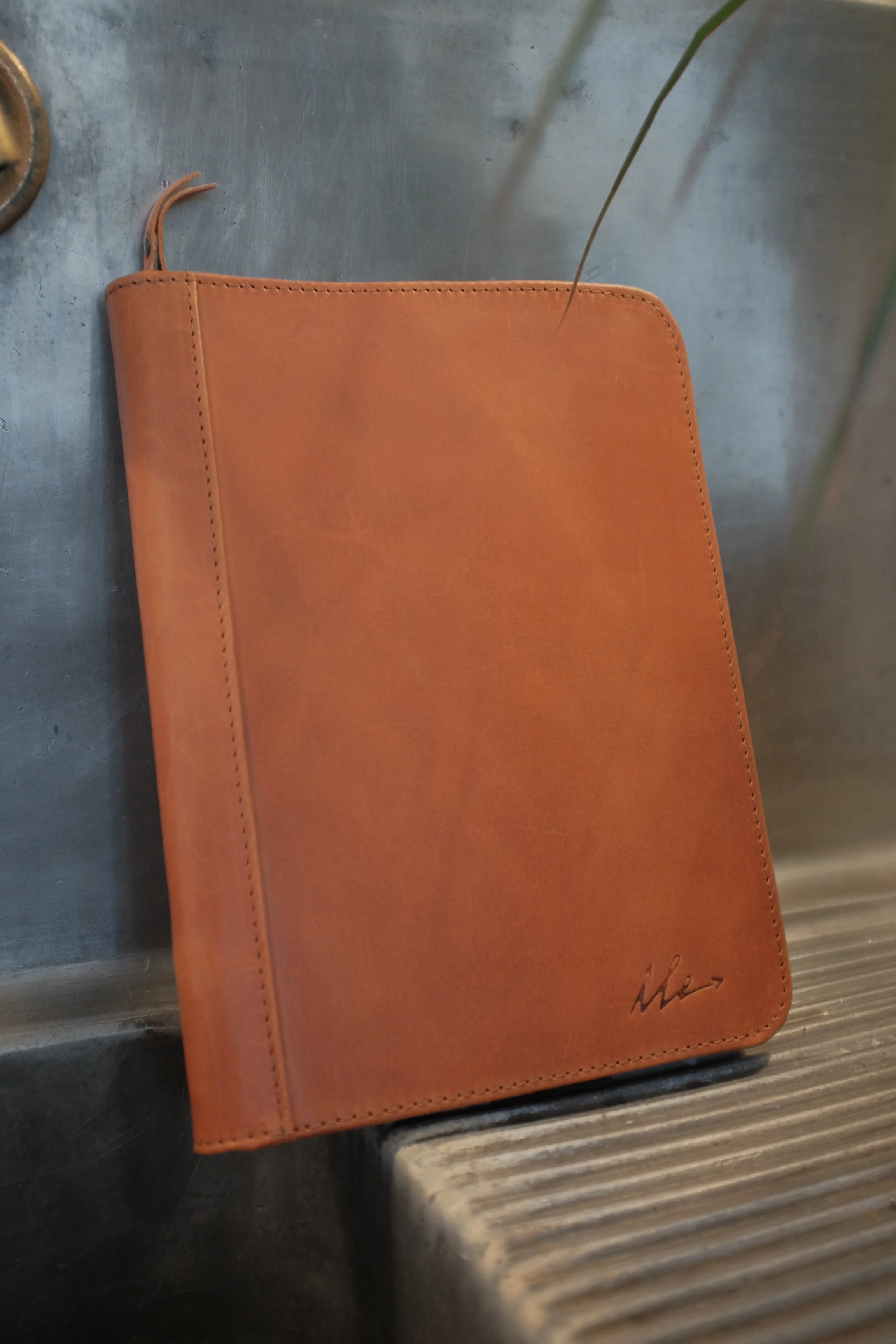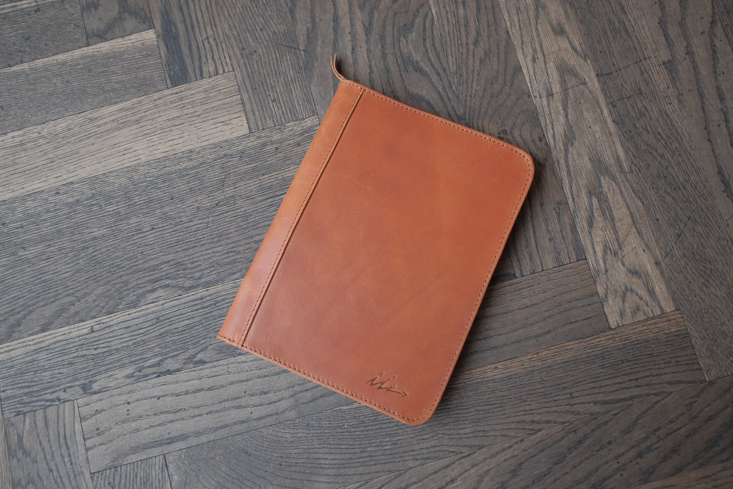 Praktisk mappe foret med tekstil, som holder orden i papirer, notater, kvitteringer, visittkort etc. Nettbrett har plass i venstre side og A4-ark får akkurat plass i samme rom. Små lommer til penner/blyanter eller strikkepinner. Suveren til strikke-tilbehør.